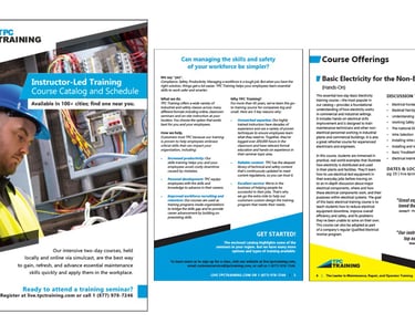 For this brochure marketing instructor-led electrical training seminars, I focused on clarity and impact. Using bold colors to catch the eye, the layout remains conservative and professional, keeping the design approachable and organized. Course descriptions and discussion topics are presented in a clean, easy-to-read format, allowing readers to quickly grasp what’s offered without feeling overwhelmed.