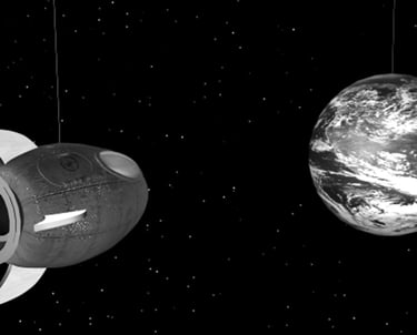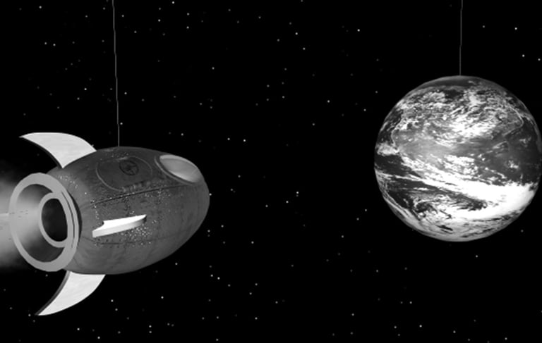 For an opening 3D animation, I drew inspiration from classic sci-fi like Flash Gordon and vintage space adventures, imagining rockets and planets on strings to give it that playful, retro-futuristic vibe. The animation features exhaust smoke that constantly drifts upward, while grainy, slightly broken footage textures give it the feel of an old film reel. The result blends nostalgia with a modern 3D aesthetic.
